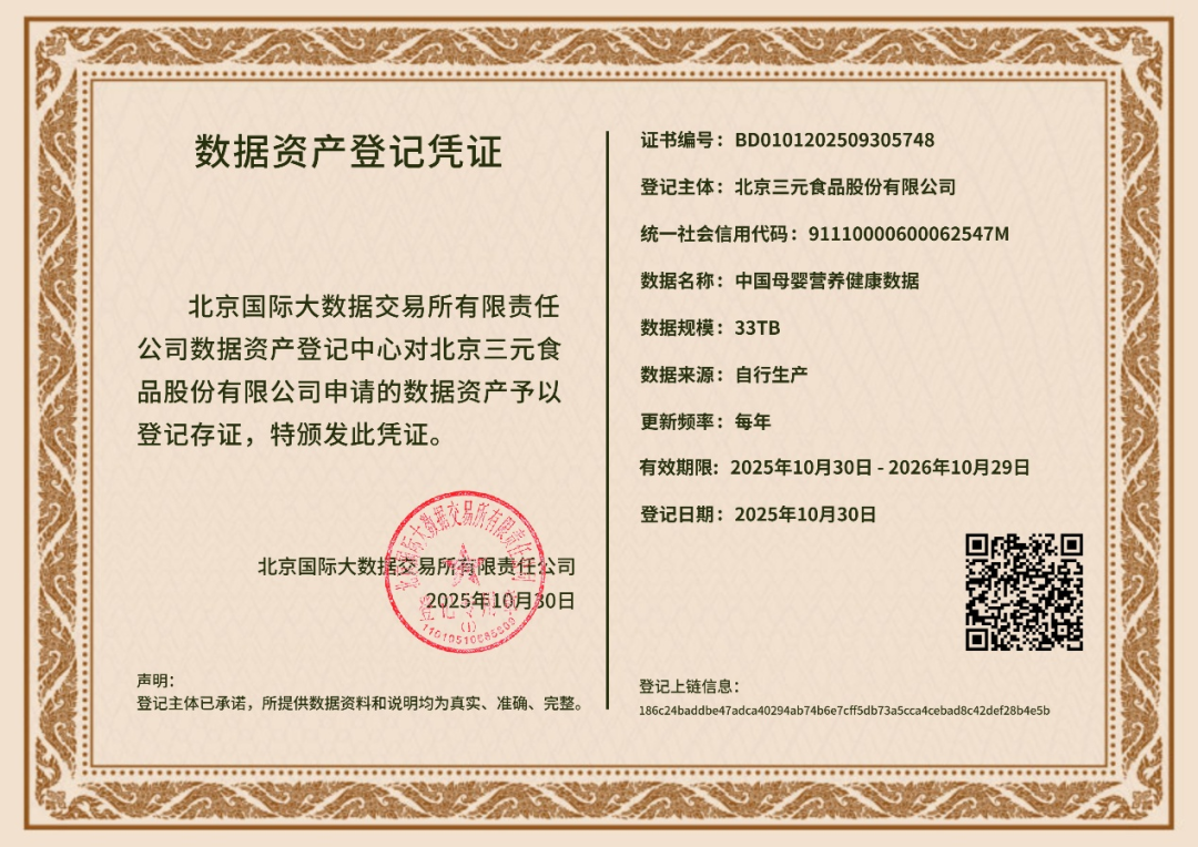 10月30日,北京三元食品股份有限公司(“三元食品”)“中国母婴营养健康数据”获批数据资产证书。该数据资产是三元食品首席科学家、国家母婴乳品健康工程技术研究中心主任陈历俊及其团队在母婴营养健康研究方面十年持续深耕的成果,是三元食品在数据领域精耕细作、持续创新的生动写照。
