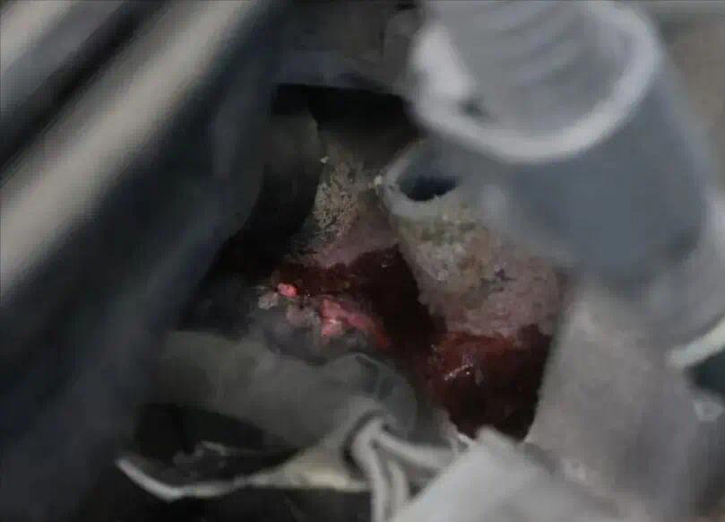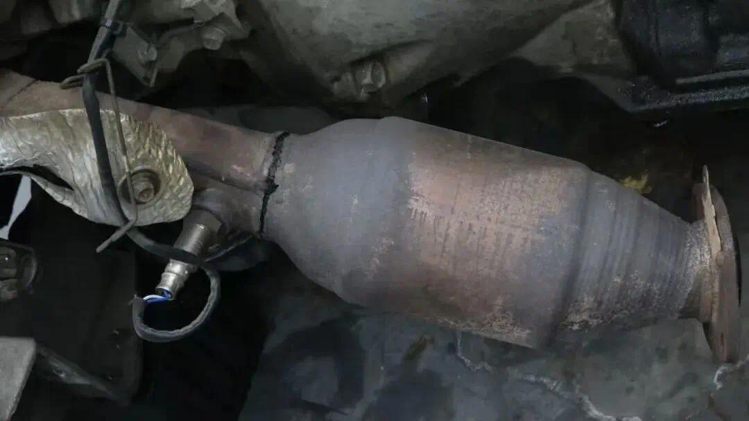 刚拆下机器就发现“惊喜”。三元催化直接是断裂状态,我记着车主不是修过排气管吗?为啥现在是断的?原因就是修理厂给车主换了一个副厂的排气管,而且安装的时候没有找个合适的固定位置,然后这排气尾段就处于一个半悬空的状态,排气管来回动,焊接三元的地方直接就断了。